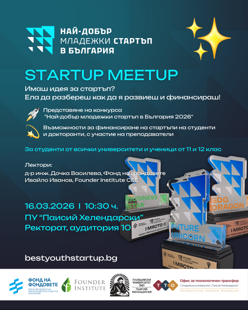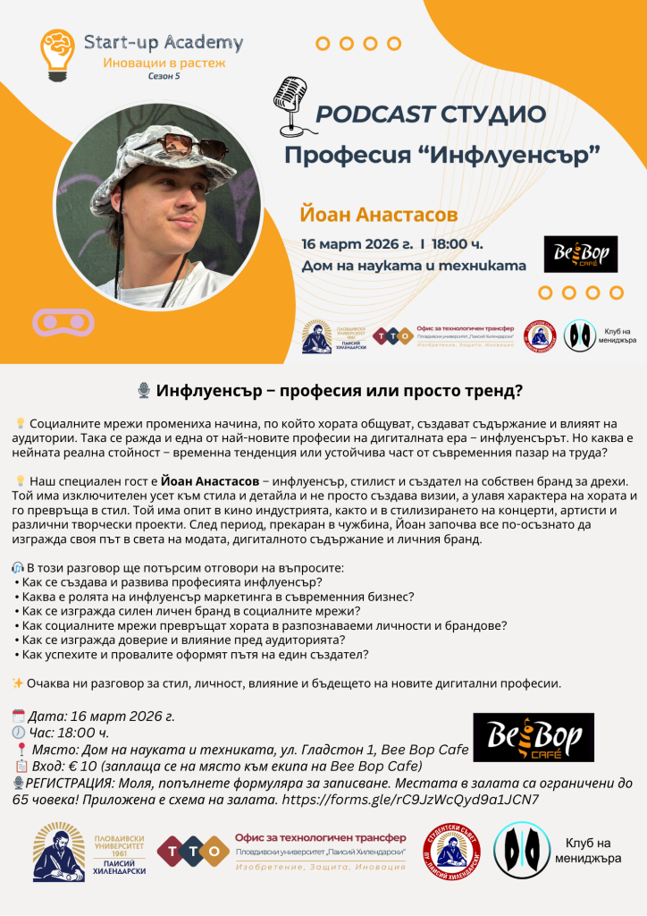 Събития СЕЗОН 5 Start-up Academy 2026 г. Предприемачеството: от мечта към реалност Дата: 3 декември 2025Час: 17:00 ч.Място: 7-ма аудитория, ПУ „Паисий Хилендарски“ (Ректорат)Лектори: Стоил и Петя Палхутеви, RAIN International Видео запис от лекцията на Стоил и Петя Палхутеви Специализирано събитие – мениджмънт на туристическия бизнес Дата: 10 декември 2025Час: 17:00 ч.Място: 7-ма аудитория, ПУ „Паисий Хилендарски“ (Ректорат)Лектор: Мариела Балчева, хотели Хилтън Видео запис от лекцията на Мариела Балчева PODCAST STUDIO Дата: 18 февруари 2026Час: 18:00 ч.Място: Дом на науката и техниката, BeeBop CafeГости: доц. д-р Д. Деков и доц. д-р М. Ангелова Видео запис от подкаста с доц. д-р Д. Деков и доц. д-р М. Ангелова HR: Rush for Practice Дата: 12 март 2026Час: 16:30 ч.Място: 4 ауд, РекторатНационално състезание за бъдещи HR специалисти Видео запис от откриването на състезанието – очаквайте скоро! Финансиране на стартъпи Дата: 16 март 2026Час: 10:30 ч.Място: 10 ауд, РекторатЛектори: д-р инж. Дочка Василева (Фонд на фондовете) и Ивайло Иванов (Founder Institute) Снимки от събитието – посетете фейсбук страницата на ТТО www.facebook.com/TTOUniPlovdiv PODCAST studio: Професия „Инфлуенсър“ Дата: 16 март 2026Час: 18:00 ч.Място: Дом на науката и техниката, BeeBop CafeГост: Йоан Анастасов Видео запис от подкаста с Йоан Анастасов
